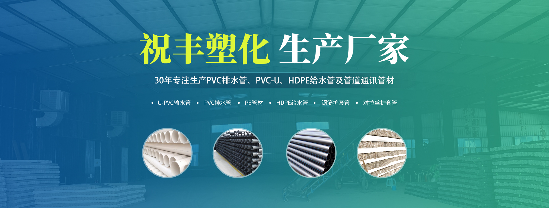 安陽市祝豐塑化有限公司坐落在滑縣工業園區,東臨大廣高速,西臨京珠高速,是鄭州、鶴壁、安陽、濮陽四個城市的輸紐,交通便利、環境優美。       公司始建于八十年代,經過二十余年的艱辛創業,規模不斷壯大,由十多萬元資產的小廠,發展到現占地面積達一萬多平,建筑面積一萬平,資產2000多萬元管材生產企業。公司生產PVC-U、PVC排水管、HDPE給水管、鋼筋護套管管道通訊管材等產品,廣泛用于農田節水、高山引水、人畜用水、建筑、電力通訊等多種用途,品種齊全。為了滿足用戶需求,可承攬各種給水、節水、灌溉工程?!白XS塑化”憑借強勁的實力,優良的管理水平。“以質量求生存,以信譽求發展”的原則全力以赴和大家共同塑造美好未來。..
